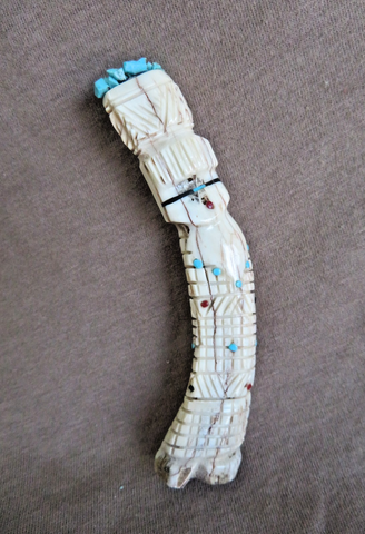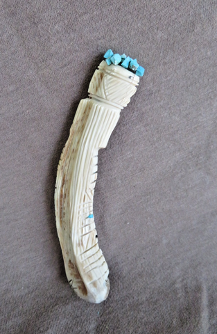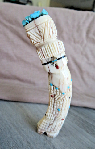 You are looking at a Native Zuni made Antler Olla (Bowl) Maiden Fetish Carving made by Zuni artist Carl Etsate Carving is 4" tall, .65" deep and 1" wide. Features coral , jet and turquoise embellishments.. Carving is initialed on the bottom and purchased directly from Carl in Zuni. Great addition to any collection!!