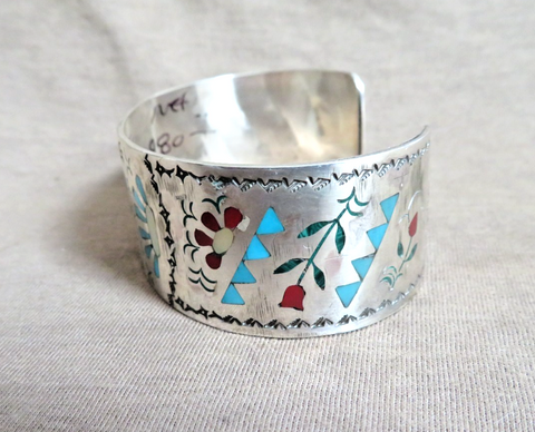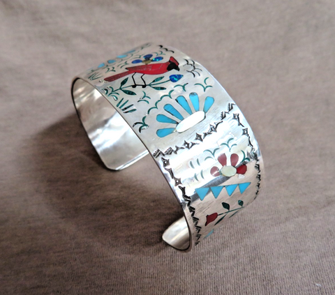 You are looking at a gorgeous Native Zuni made Multi-stone inlay Cardinal Cuff Bracelet made by known artists -  Sammy and Esther Guardian.  This gorgeous bracelet is 6.25" around with a 1.3" gap.  The bracelet is 1.1" wide and features a highly detailed cardinal with flowers and native symbols.  Features turquoise, coral, mother of pearl, and opal.  Bracelet is not adjustable due to inlay work.  Bracelet is marked S&E, Sterling.  Great opportunity to get a gorgeous bracelet!!
