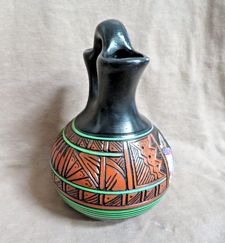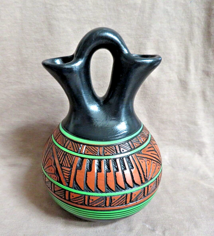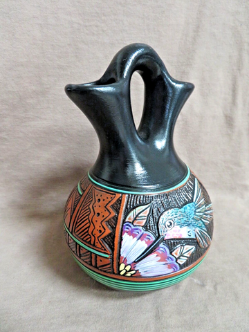 You are looking at a Native Navajo Hand Etched Hummingbird Wedding Vase Pottery made by Navajo potter Paul Lansing. Great wedding vase! Vase is 6.75" tall and 4.75" wide. Gorgeous use of color and amazing details. It is etched signed on the bottom Paul Lansing, Dine.