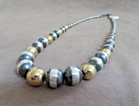 You are looking at a Classic Native Navajo sensational and elegant Graduated Sterling Silver and 18kt overlay accent beads Navajo Pearls necklace.  This amazing necklace measures 18" long and features hook clasp.  Goes with anything - very new style.