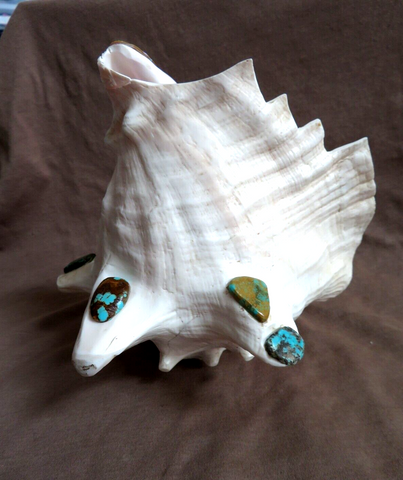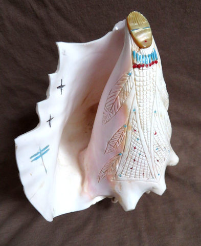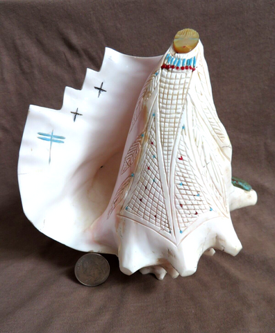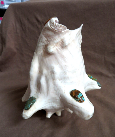 You are looking at an AMAZING Very Large Conch shell Corn Maiden ZUNI Fetish Carving made by Known Carver - Kevin Quam. Carving is 6.9" tall by 5.5" deep and 6.5" wide. Has gorgeous abalone face, turquoise and coral necklace and multi-stone embellishments and feather carvings on this maiden! Also has turquoise chip offerings. Gorgeous maiden!!! Purchased directly from Kevin in Zuni. Great opportunity to get a great harder to find carving!!