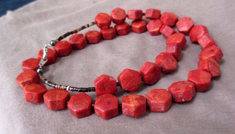 You are looking at a beautiful Navajo hand strung Apple Coral and heishi single strand Necklace made by Navajo artist Dinah Bekeyah. Necklace is 23" long and features silver clasp and striking geometrically cut apple coral stones.