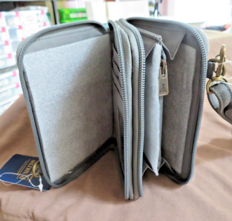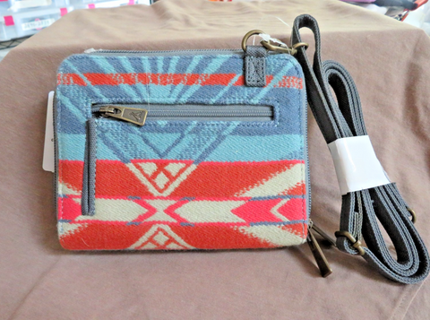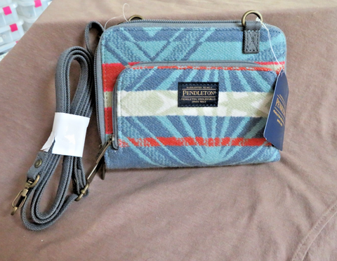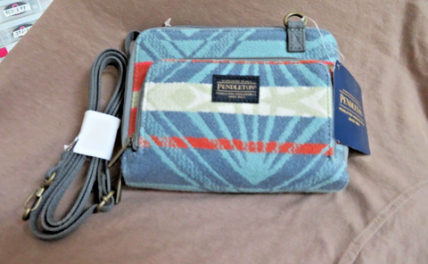 You are looking at a new with tags, Pendleton purse/wallet on a strap with the Coquille River Pattern. This beautiful mini purse/wallet made of Pendleton wool has 4 zipper compartments and a nylon adjustable strap. Purse is 7" wide, 5.25" tall and 2" deep. A zipper compartment has id and credit card slots and another compartment has 2 large pockets with a separating zipper security pocket. Gorgeous pattern features shades of blue, coral and cream. Gorgeous wallet!!