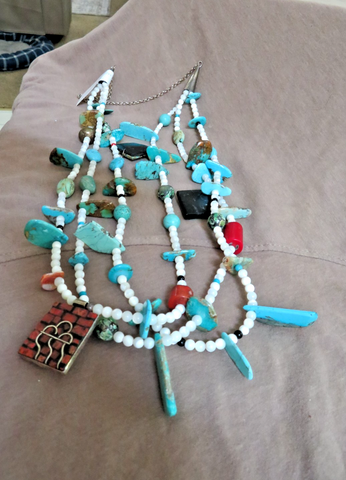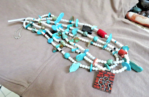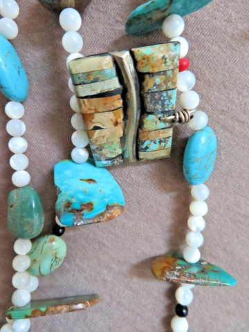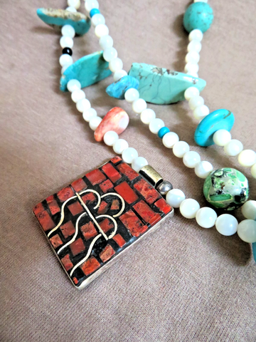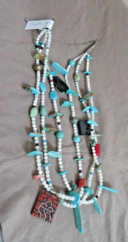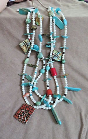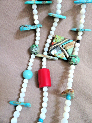 You are looking at a Unique One of a Kind Native Santo Domingo Handmade Mother of Pearl and Multi-stone 3 Strand 32" Necklace made by great Santo Domingo harder to find artist - Timothy Bailon. Tim has a distinguished style and design and creates an array of real statement pieces. Stones include turquoise, coral, jet, spiny oyster and 3 of Tim's signature inlay pieces. This necklace is a one of a kind showpiece, that I purchased several years back!! .
