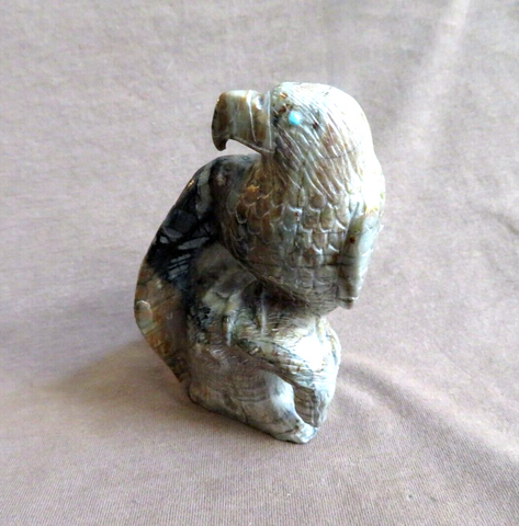 You are looking at a Museum Quality Extra Large Picasso Marble Eagle perched on a branch Zuni fetish carving made by MASTER CARVER Derrick Kaamasee.  Carving is 4" tall and 2.1 " deep and 2.25" wide.  Eagle features turquoise eyes and great incredible detail that Derrick is known for!! !!   Bottom is signed DK Zuni.  Great opportunity to get a fantastic carving from one of the best living carvers.