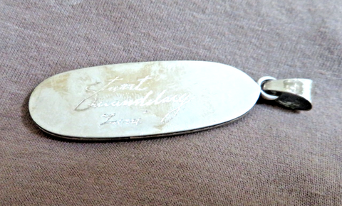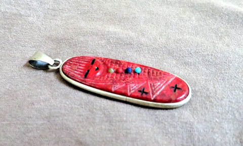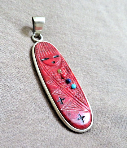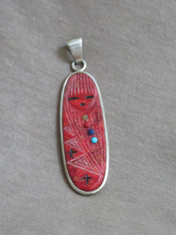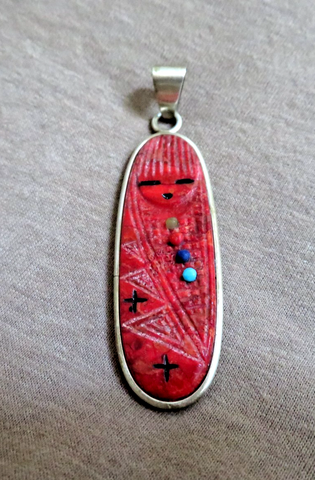 You are looking at a RARE Zuni made gorgeous Apple Coral and Sterling Silver Zuni Made Corn Maiden Pendant by known artist Stuart Quandelacy (D), who passed several years back. I purchased directly from Stuart in Zuni approximately 4 years ago. This script signed pendant features a classic corn maiden with multi-stone embellishments and features Stuart's signature on the back. Stuart was known for his maidens and carvings! Pendant is 2" long and .75: wide without the bale. Great opportunity to snag this rare classic pendant!