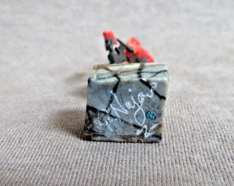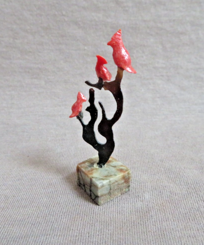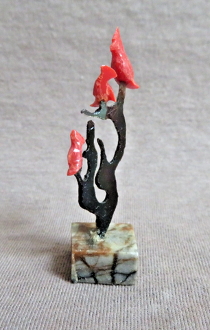 You are looking at an incredible Miniature Coral Cardinals on Abalone branch ZUNI Fetish carving made by GREAT CARVER Ruben Najera. Carving is 2" tall, and 1" wide and .75" deep. Features amazing details. Sits on picasso marble base. Bottom is signed R Najera, Zuni. Great opportunity to get a fantastic carving from an amazing artist in Zuni!!