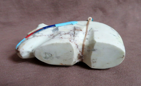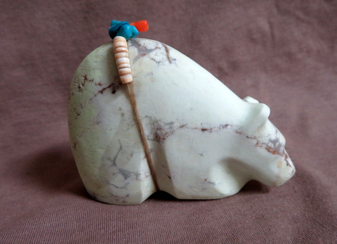 You are looking at a museum quality Serpentine Bear ZUNI Fetish Carving made by Donovan Laiwakete. Carving is 3.5" long, and 2.6" tall and 1" wide. This incredible carving features turquoise eyes and turquoise, jet, and coral inlay heartline. Also features a turquoise, coral, malachite and turquoise medicine bundle. Bottom is initialed and purchased from Donovan in Zuni.