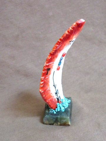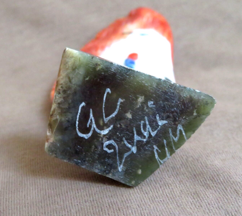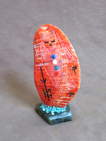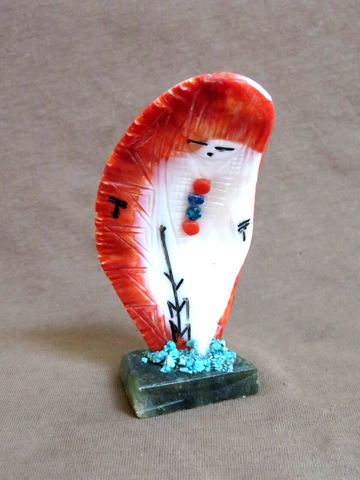 You are looking at an Amazing Spiny Oyster Two Sided Corn Maiden ZUNI Fetish made by WELL KNOWN CARVER - Gloria Chattin. Carving is 3.75" tall by 1.9" wide and 1" deep. Has carved markings and multi-stone embellishments with turquoise offering on base!! Stunning maidens!!! This is signed on the base GC, Zuni and purchased directly from artist at Zuni. Great opportunity to get a stunning carving!!